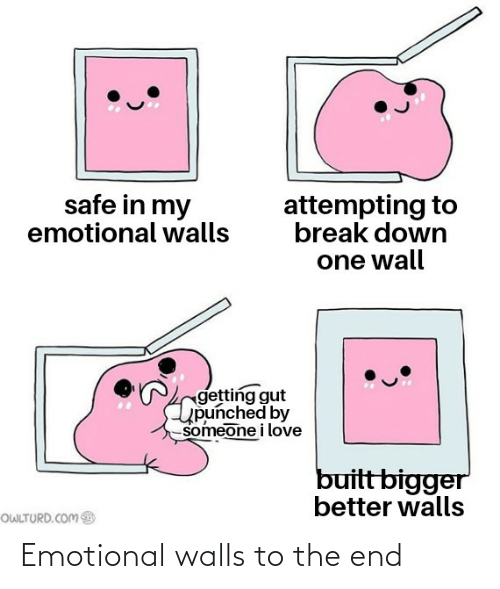 Emotional walls we are all guilty of building them up high and being stubborn as shit at letting them down because usually when we do someone always proves why we shouldn’t of let them down and we get hurt again and build that bitch right back up higher and higher everytime to a point we think one day we might actually forget how to let them down.